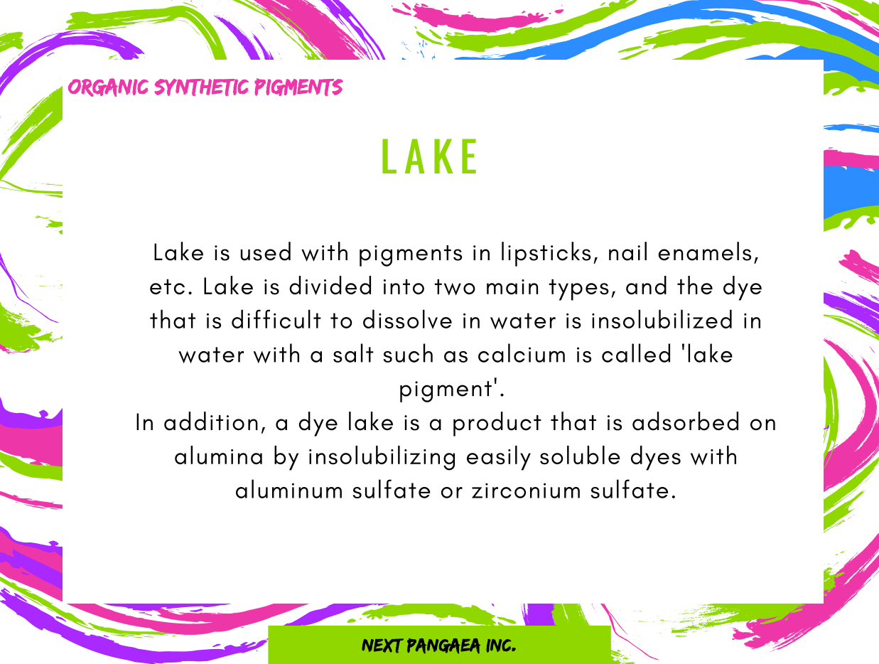 Lake is used with pigments in lipsticks, nail enamels, etc. Lake is divided into two main types, and the dye that is difficult to dissolve in water is insolubilized in water with a salt such as calcium is called 'lake pigment'.